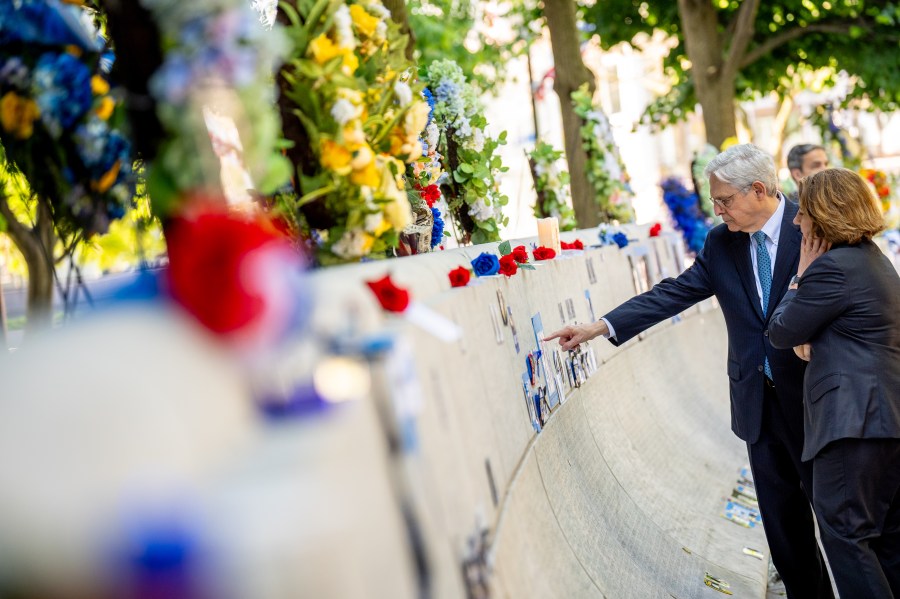 WASHINGTON, DC – MAY 13: U.S. Attorney General Merrick Garland (L) and Deputy Attorney General Lisa Monaco (R) look at photographs, flowers, and mementos left for fallen officers as they visit the National Law Enforcement Officers Memorial to commemorate the start of Police Week on May 13, 2024 in Washington, DC. May 15th was proclaimed as Peace Officers Memorial Day and the week it falls in as Police Week by President John F. Kennedy decades ago, but what started with a small group in the early 1980s has grown to thousands gathering annually in Washington, DC to reflect, honor and support police officers. (Photo by Andrew Harnik/Getty Images)