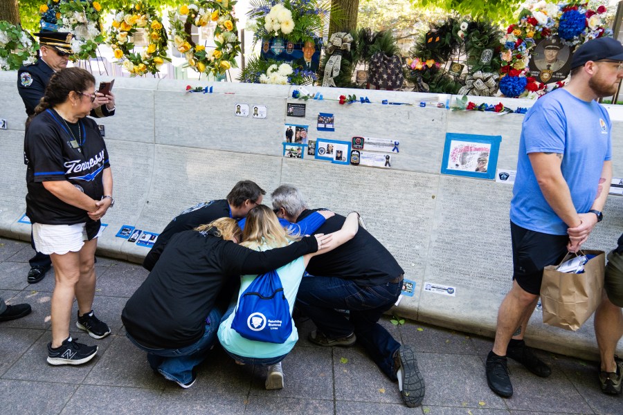 UNITED STATES – MAY 13: The family of Off. Peter Jerving, of the Milwaukee Police Department, who was killed in the line of duty on February 7, 2023, mourn during an event at the National Law Enforcement Officers Memorial to honor officers who lost their lives in 2023, on Monday, May 13, 2024. The event was part of the annual Police Week gathering. (Tom Williams/CQ-Roll Call, Inc via Getty Images)