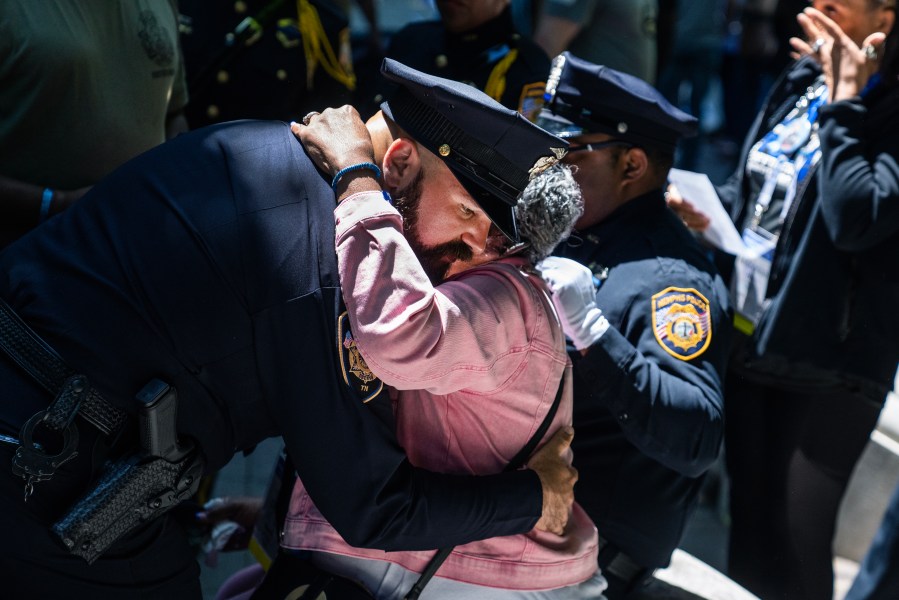 UNITED STATES – MAY 13: An officer comforts Eddie Campbell, the mother of Off. Geoffrey Redd of the Memphis Police Department, who was killed in the line of duty on February 18, 2023, during an event at the National Law Enforcement Officers Memorial to honor officers who lost their lives in 2023, on Monday, May 13, 2024. The event is part of the annual Police Week gathering. (Tom Williams/CQ-Roll Call, Inc via Getty Images)