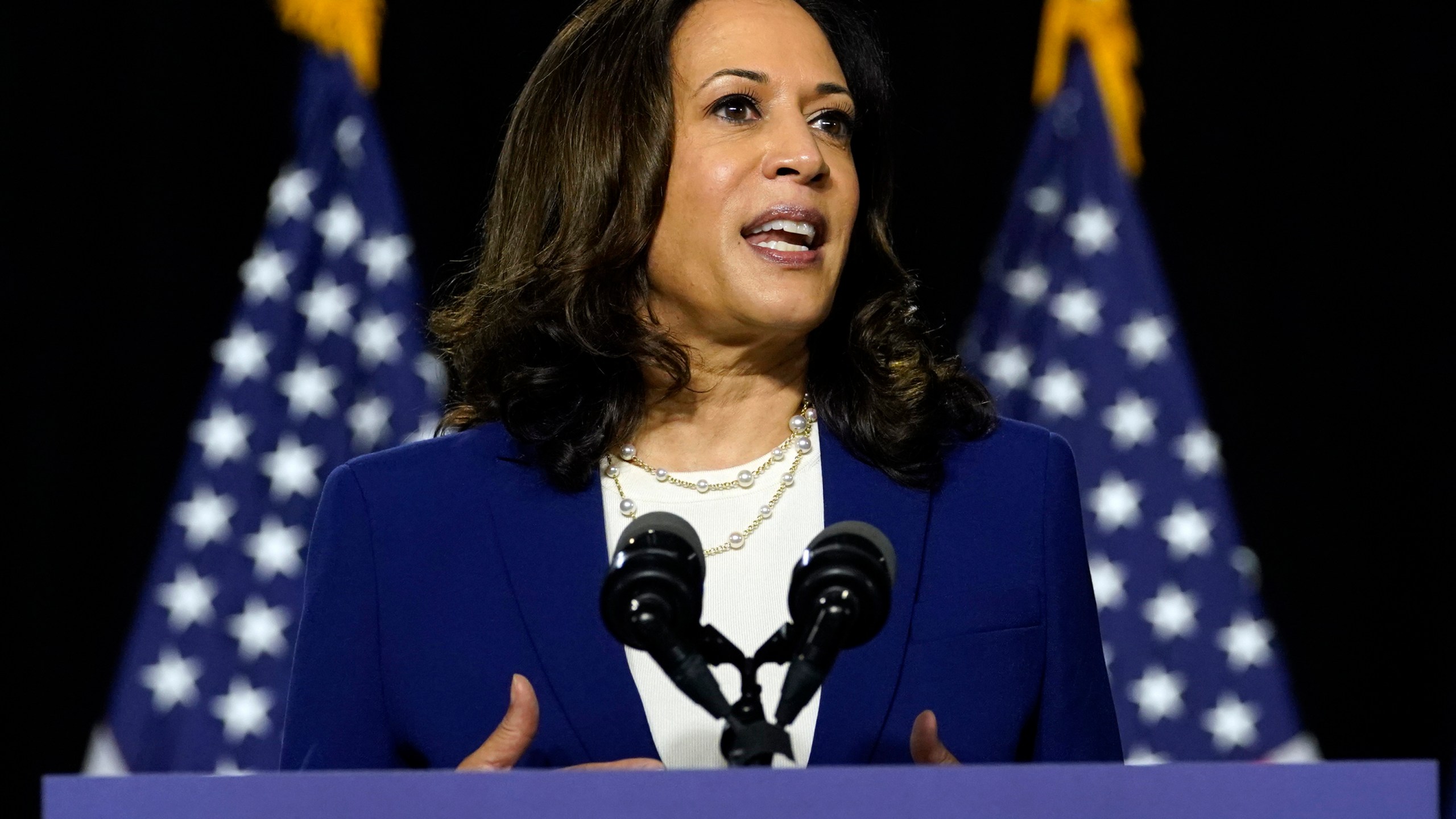 FILE – In this Aug. 12, 2020, file photo, Sen. Kamala Harris, D-Calif., speaks after Democratic presidential candidate former Vice President Joe Biden introduced her as his running mate during a campaign event at Alexis Dupont High School in Wilmington, Del. (AP Photo/Carolyn Kaster, File)
