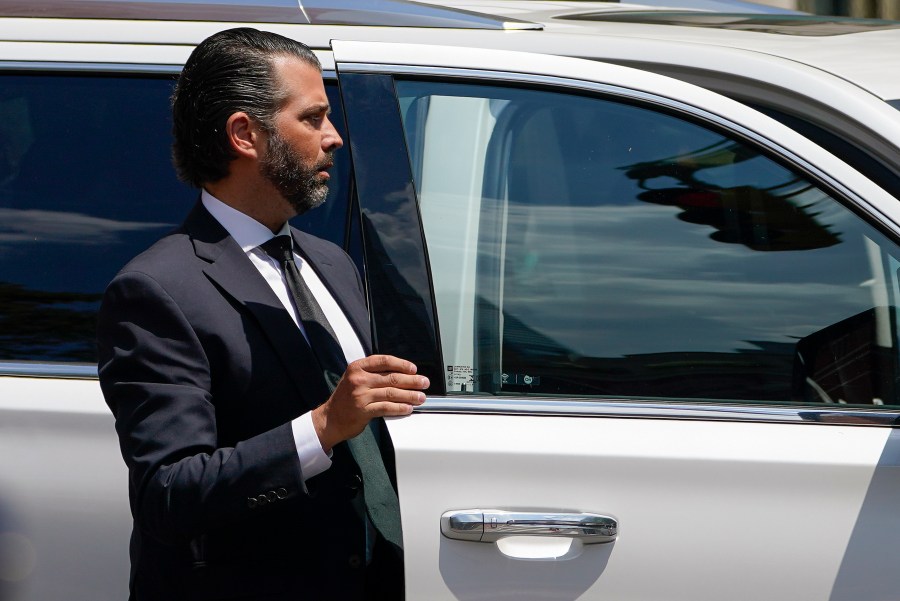 Donald Trump Jr. arrives for the funeral of Ivana Trump, Wednesday, July 20, 2022, in New York. Ivana Trump, an icon of 1980s style, wealth and excess and a businesswoman who helped her husband build an empire that launched him to the presidency, is set to be celebrated at a funeral Mass at St. Vincent Ferrer Roman Catholic Church following her death last week. (AP Photo/John Minchillo)