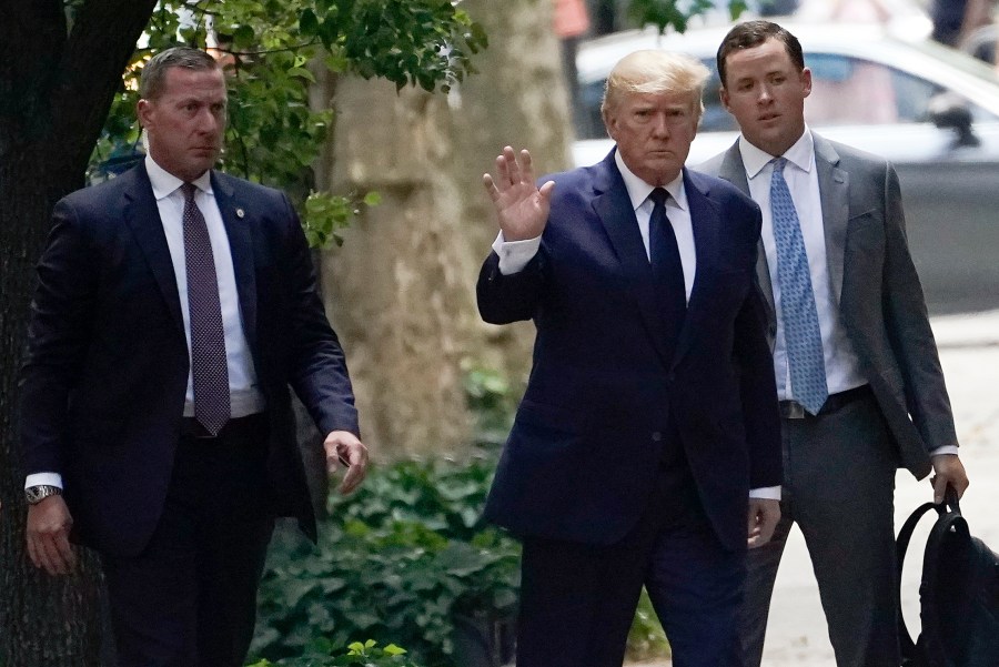 Former President Donald Trump, center, waves as he arrives for the funeral for his ex-wife Ivana Trump, Wednesday, July 20, 2022, in New York. Ivana Trump, an icon of 1980s style, wealth and excess and a businesswoman who helped her husband build an empire that launched him to the presidency, is set to be celebrated at a funeral Mass at St. Vincent Ferrer Roman Catholic Church following her death last week.(AP Photo/John Minchillo)