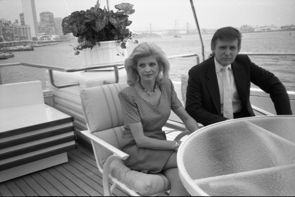 Business man Donald Trump and his wife Ivana Trump introduce the press to preview the recently refurbished 300 foot yacht, The Trump Princess, which he bought for $29 million and spent another $10 million fixing up. The yacht features accomodations for two dozen, and contains a pool, heliport, 128 phones, two dining rooms and was anchored at the Water Club in July 1988 in New York, New York. (Photo by Tom Gates/Getty Images)