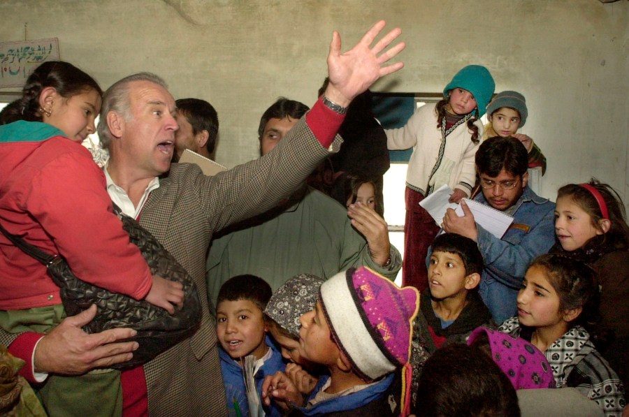 U.S. Sen. Joseph Biden, D-Del., Chairman of the U.S Senate’s Foreign Relations Committee, waves as he talks to Afghan children during a visit to the Ariana primary school in Kabul, Jan. 12, 2002. Biden was on a two-day visit to the Afghan capital. (AP Photo/Enric Marti)