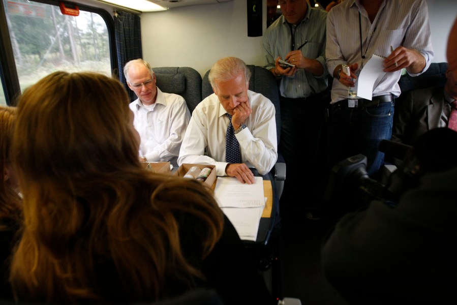 Democratic vice presidential candidate Sen. Joe Biden, D-Del. mingles with passengers on the Amtrak Acela train from Washington to Wilmington, Del., Tuesday, Sept. 16, 2008. (AP Photo/Gerald Herbert)