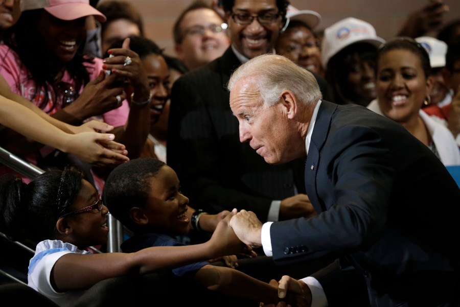 Vice President Joe Biden greets Lawrence Smith, 8, and Madison King, 9, both of Van Buren Township, Mich., during a campaign stop at Renaissance High School, Wednesday, Aug. 22, 2012, in Detroit. (AP Photo/Paul Sancya)