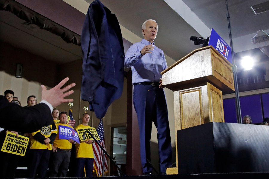 Former Vice President and Democratic presidential candidate Joe Biden tosses his jacket off stage as he begins to speak during a rally at the Teamster Local 249 Hall in Pittsburgh, Monday, April 29, 2019. (AP Photo/Gene J. Puskar)