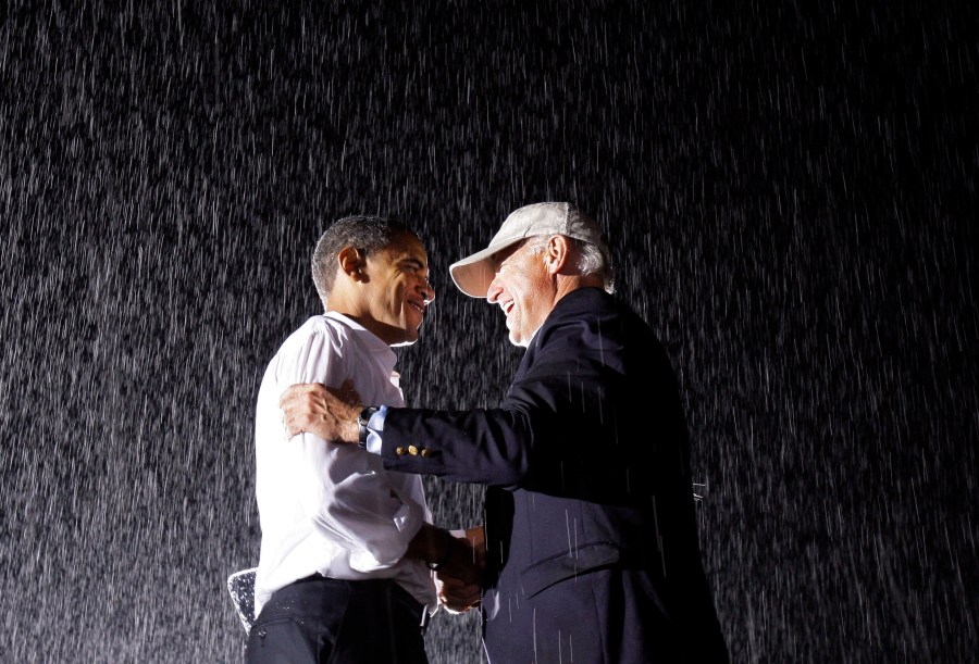 Democratic presidential candidate Sen. Barack Obama D-Ill., shakes hands with democratic vice presidential candidate Sen. Joe Biden, D-Del., at a rally in the rain at the University of Mary Washington in Fredericksburg, Va., Saturday, Sept. 27, 2008. (AP Photo/Alex Brandon)
