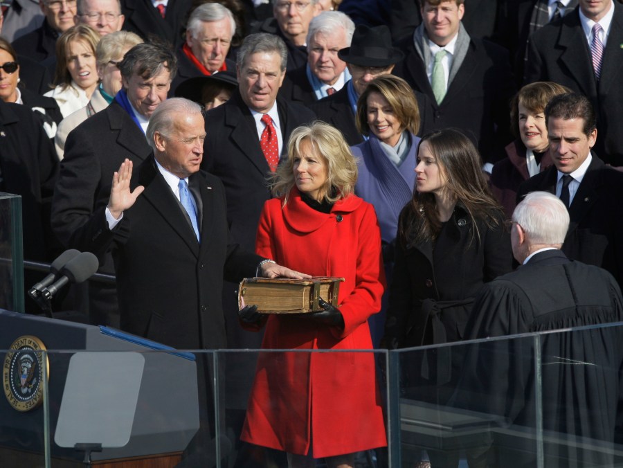 Vice President-elect Joe Biden, with his wife Jill at his side, takes the oath of office from Justice John Paul Stevens, as his wife holds the Bible at the U.S. Capitol in Washington, Tuesday, Jan. 20, 2009. (AP Photo/Elise Amendola)