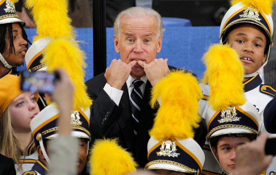 Standing amid members of the Euclid High School marching Band, Vice-President Joe Biden whistles to get someone’s attention following a campaign stop at a fire station in Euclid, Ohio, Tuesday, Nov. 15, 2011. (AP Photo/Amy Sancetta)