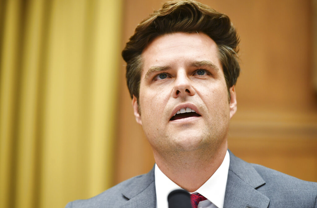 FILE – In this July 29, 2020 file photo Rep. Matt Gaetz, R-Fla., speaks during a House Judiciary subcommittee hearing on antitrust on Capitol Hill in Washington. Federal prosecutors are examining whether Gaetz and a political ally who is facing sex trafficking allegations may have paid underage girls or offered them gifts in exchange for sex, two people familiar with the matter told The Associated Press on Friday, April 2, 2021. (Mandel Ngan/Pool via AP, File)