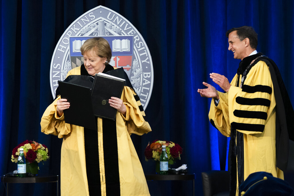 Also Thursday, Merkel received an honorary doctorate, her 18th, from Johns Hopkins University and spoke at the university’s School of Advanced International Studies.