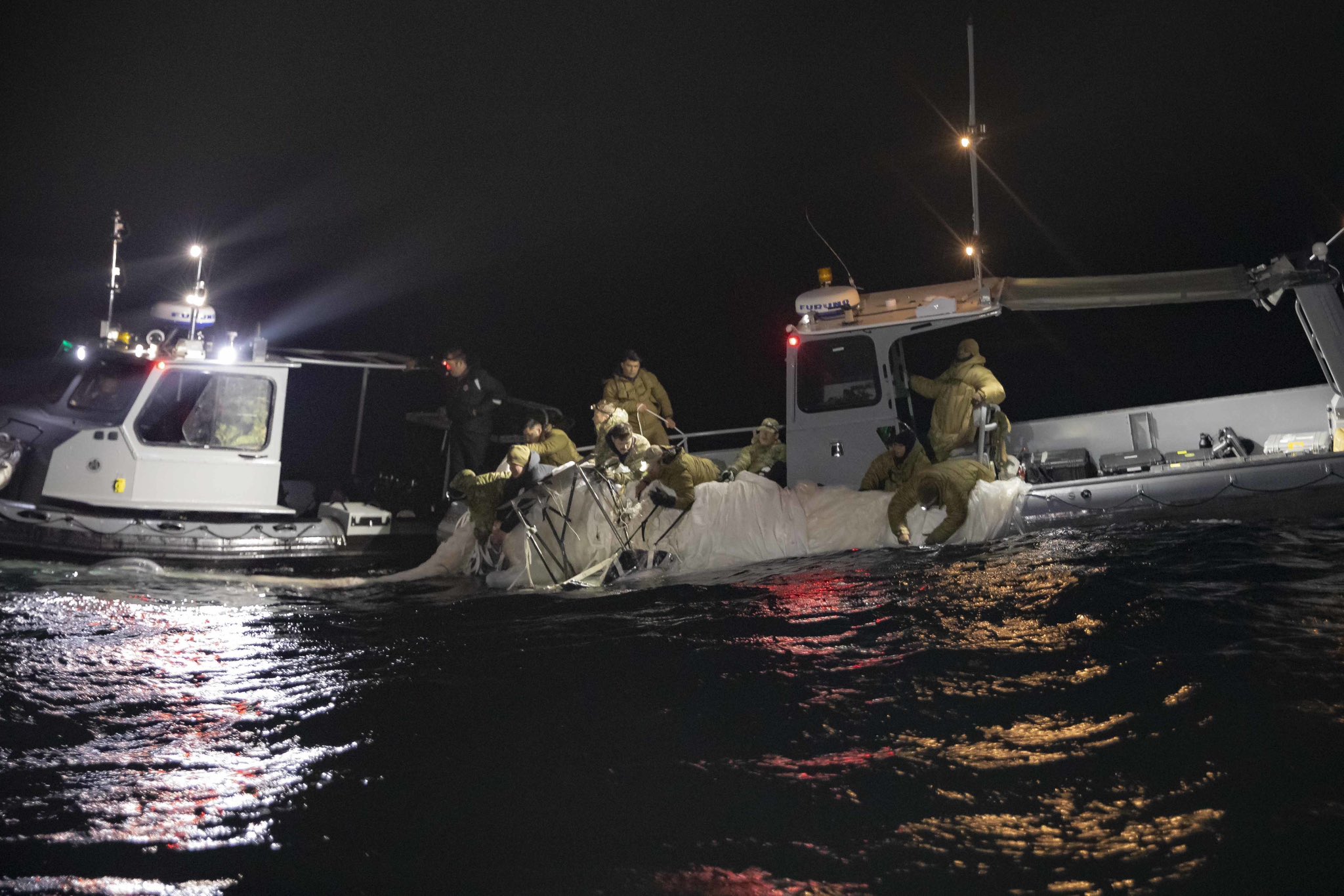 Pictures posted on Twitter were of sailors assigned to an Explosive Ordnance Disposal Group recovering the high-altitude balloon off the coast of Myrtle Beach, South Carolina on Feb. 5. The balloon had been shot down the previous day.