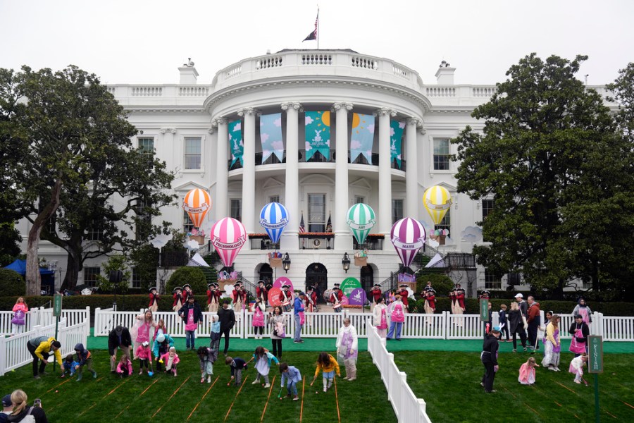 The White House Easter Egg Roll begins on the South Lawn of the White House in Washington, Monday, April 1, 2024. Thunder and lightning delayed the start of the Easter egg roll at the White House for 90 minutes on Monday, but the event eventually kicked off under gray skies and internment rain. More than 40,000 people, 10,000 more than last year, were expected to participate in the event. (AP Photo/Mark Schiefelbein)