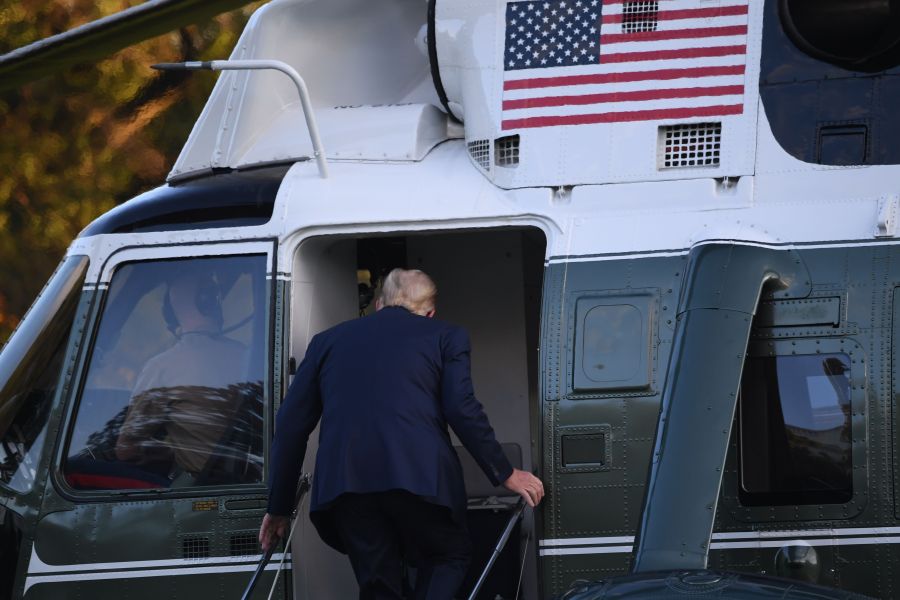 US President Donald Trump boards Marine One prior to departure from the South Lawn of the White House in Washington, DC, October 2, 2020, as he heads to Walter Reed Military Medical Center, after testing positive for Covid-19. – President Donald Trump will spend the coming days in a military hospital just outside Washington to undergo treatment for the coronavirus, but will continue to work, the White House said Friday (Photo by SAUL LOEB / AFP) (Photo by SAUL LOEB/AFP via Getty Images)