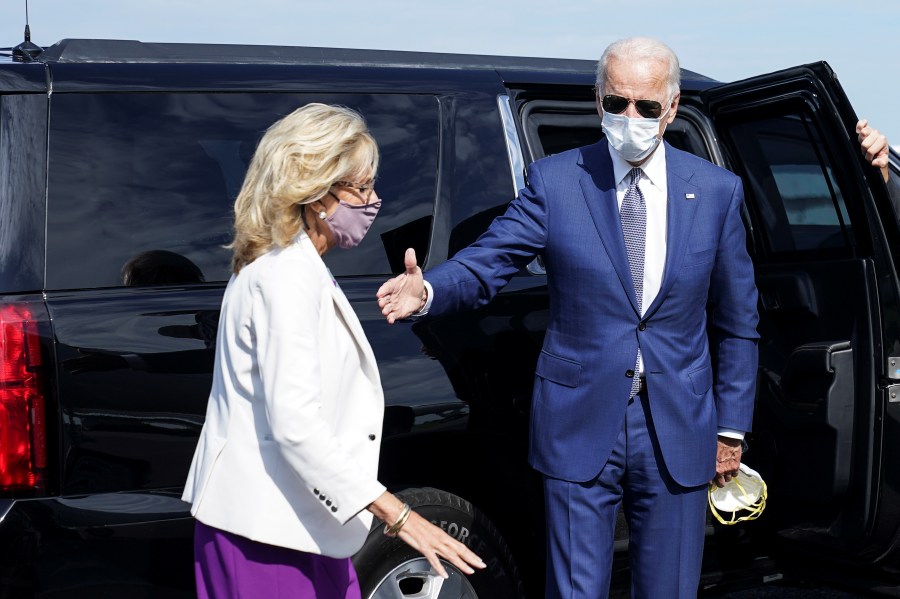 Democratic presidential nominee and former Vice President Joe Biden and his wife, Dr. Jill Biden, exit their SUV as they prepare to depart Wilmington for travel to Kenosha, Wisconsin at New Castle County Airport in New Castle, Delaware, U.S., September 3, 2020. REUTERS/Kevin Lamarque