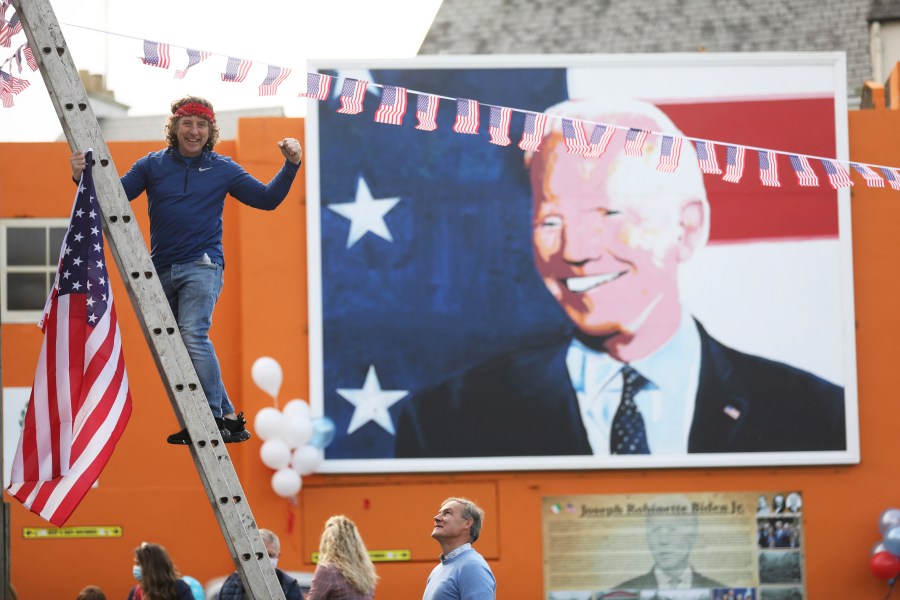 A man puts a US flag up in the town of Ballina, the ancestral home of President elect Joe Biden, in North West of Ireland, Saturday, Nov. 7, 2020. Biden was elected Saturday as the 46th president of the United States, defeating President Donald Trump in an election that played out against the backdrop of a pandemic, its economic fallout and a national reckoning on racism. (AP Photo/Peter Morrison)