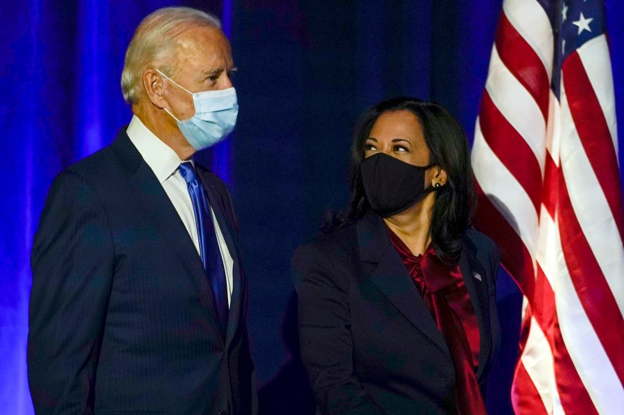 FILE – In this Nov. 6, 2020, file photo then-Democratic presidential candidate former Vice President Joe Biden arrives with his running mate Sen. Kamala Harris, D-Calif., to speak in Wilmington, Del. President-elect Biden turns 78 on Friday, Nov. 20. (AP Photo/Carolyn Kaster, File)