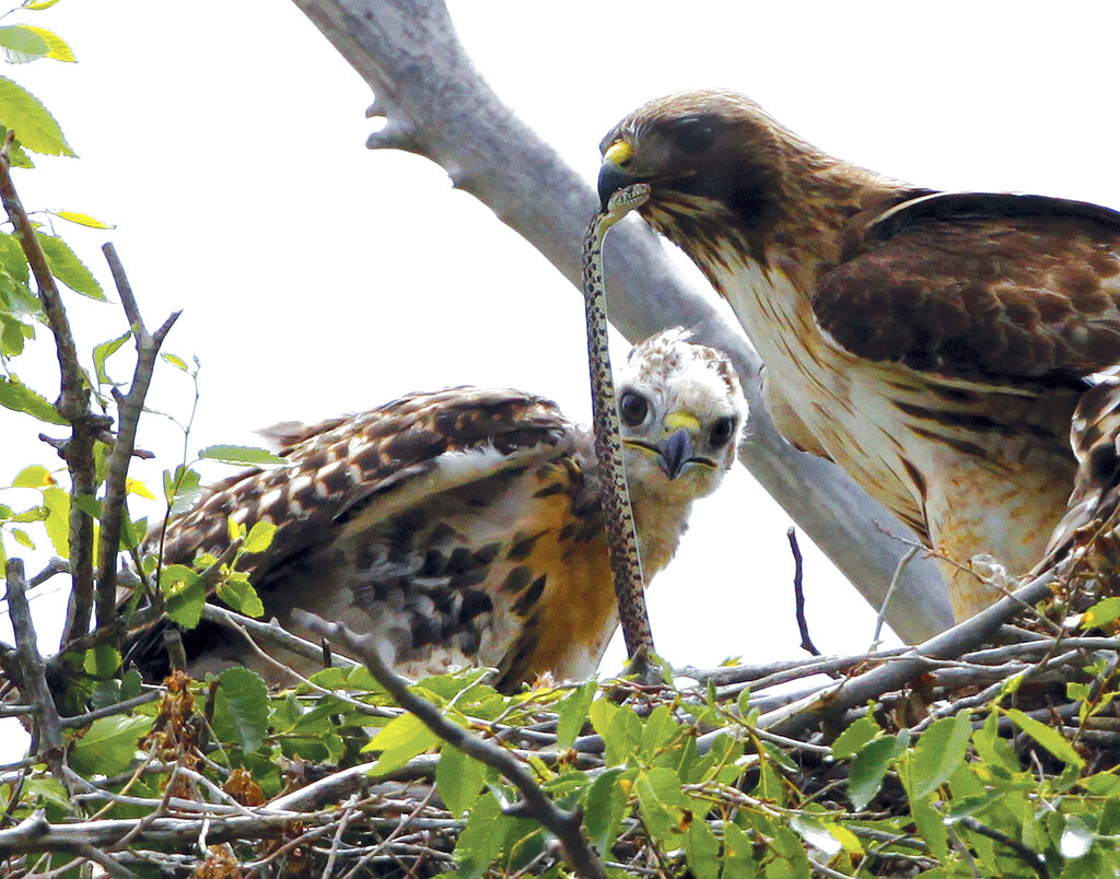 FILE – This June 5, 2009, file photo shows a Redtail hawk feeding a snake to one of her young ones nested at the Rocky Mountain Wildlife Refuge in Commerce City, Colo. The Migratory Bird Treaty Act of 1918 is a vital tool for protecting more than 1,000 species of birds including hawks and other birds of prey. (AP Photo/Ed Andrieski, File)