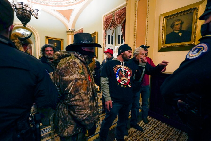 3:20 p.m. – Police with guns drawn watch as protesters try to break into the House Chamber at the U.S. Capitol.
