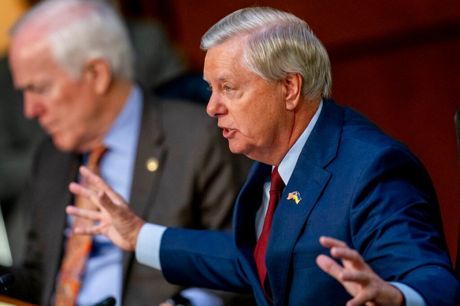 Sen. Lindsey Graham, R-S.C., right, accompanied by Sen. John Cornyn, R-Texas, left, questions Supreme Court nominee Ketanji Brown Jackson during her Senate Judiciary Committee confirmation hearing on Capitol Hill in Washington, Wednesday, March 23, 2022. (AP Photo/Andrew Harnik)