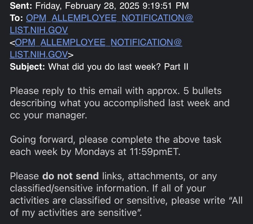 Should workers be completing classified work, this week’s email says they should reply with “All of my activities are sensitive.”