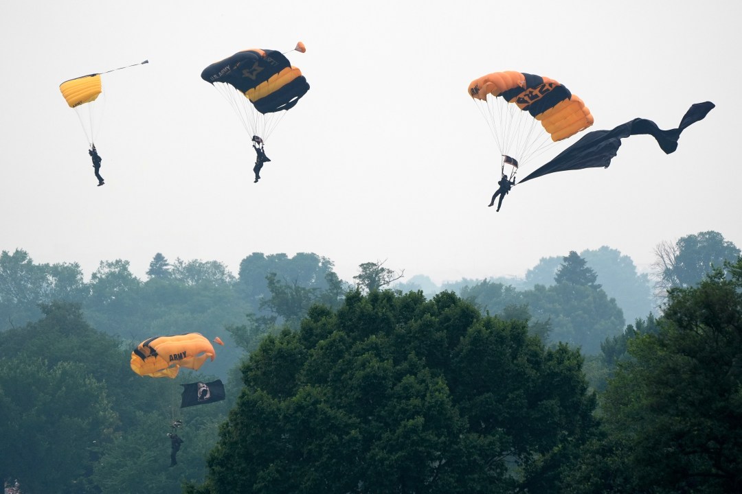 Members of the U.S. Army Parachute Team Golden Knights make their landing during an event to honor the Army’s 250th anniversary, coinciding with President Donald Trump’s 79th birthday, Saturday, June 14, 2025, in Washington. (AP Photo/Mark Schiefelbein)