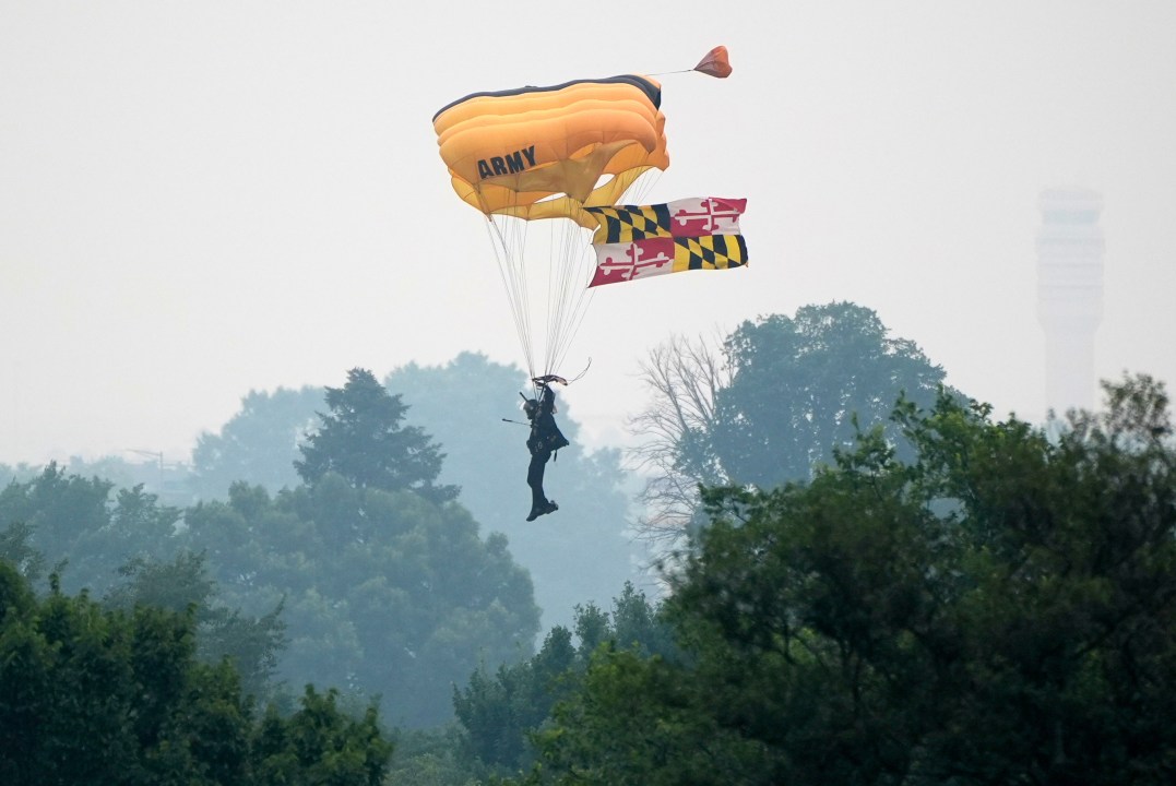 A member of the U.S. Army Parachute Team Golden Knights carries the Maryland state flag as they make their landing during an event to honor the Army’s 250th anniversary, coinciding with President Donald Trump’s 79th birthday, Saturday, June 14, 2025, in Washington. (AP Photo/Mark Schiefelbein)