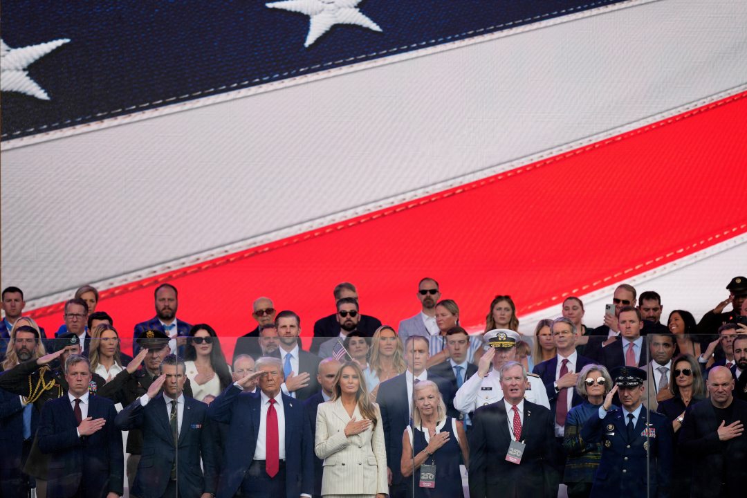 President Donald Trump, first lady Melania Trump, and other guests stand for the National Anthem, during a military parade commemorating the Army’s 250th anniversary, coinciding with his 79th birthday, Saturday, June 14, 2025, in Washington. (AP Photo/Julia Demaree Nikhinson)