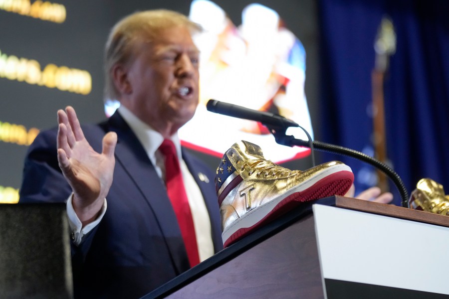 Gold Trump sneakers sit on the podium after Republican presidential candidate former President Donald Trump spoke at Sneaker Con Philadelphia, an event popular among sneaker collectors, and announces a gold Trump sneaker, in Philadelphia, Saturday, Feb. 17, 2024. (AP Photo/Manuel Balce Ceneta)