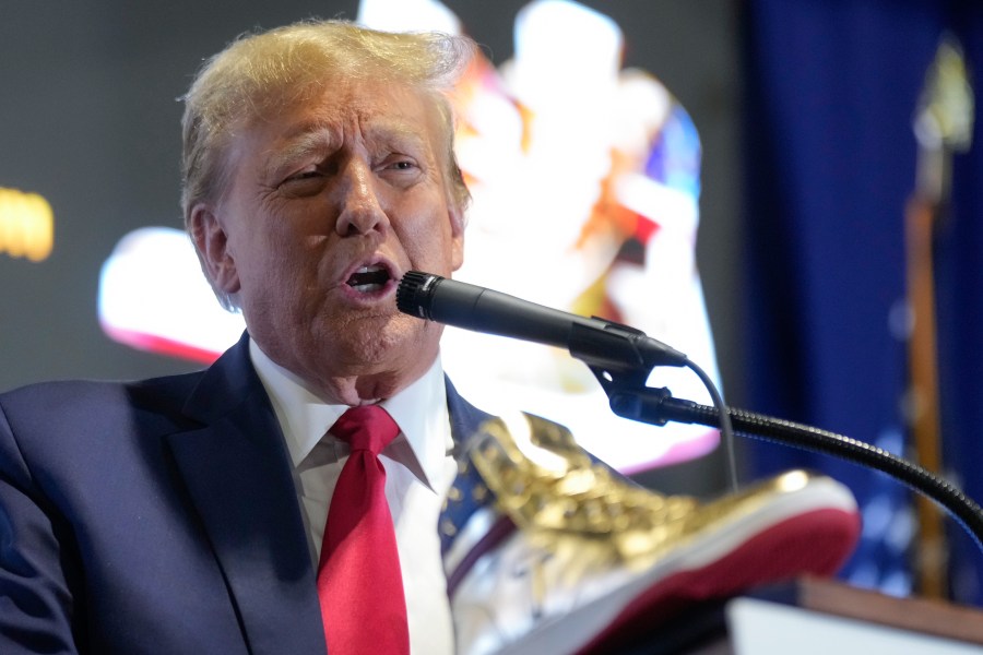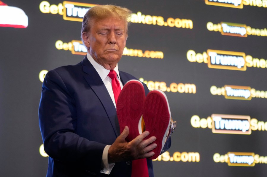 Republican presidential candidate former President Donald Trump attends Sneaker Con Philadelphia, an event popular among sneaker collectors, in Philadelphia, Saturday, Feb. 17, 2024. Trump announced a line of shoes bearing his name. (AP Photo/Manuel Balce Ceneta)