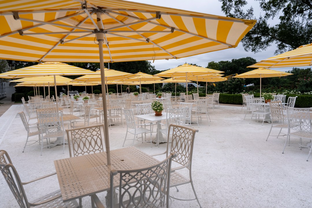 Yellow and white striped umbrellas are open in the recently renovated Rose Garden at the White House, Tuesday, Aug. 19, 2025, in Washington. (AP Photo/Alex Brandon, Pool)