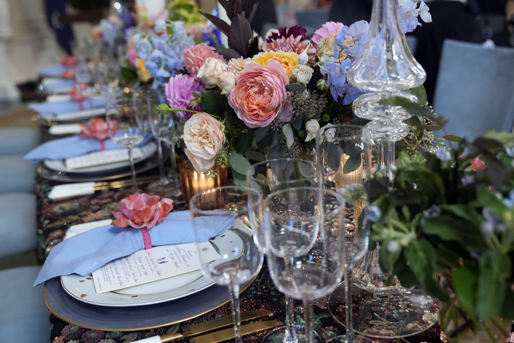 The table setting for the State Dinner on Wednesday with Australia’s Prime Minister Anthony Albanese is seen in the State Dining Room during a media preview Tuesday, Oct. 24, 2023, at the White House in Washington. (AP Photo/Mark Schiefelbein)