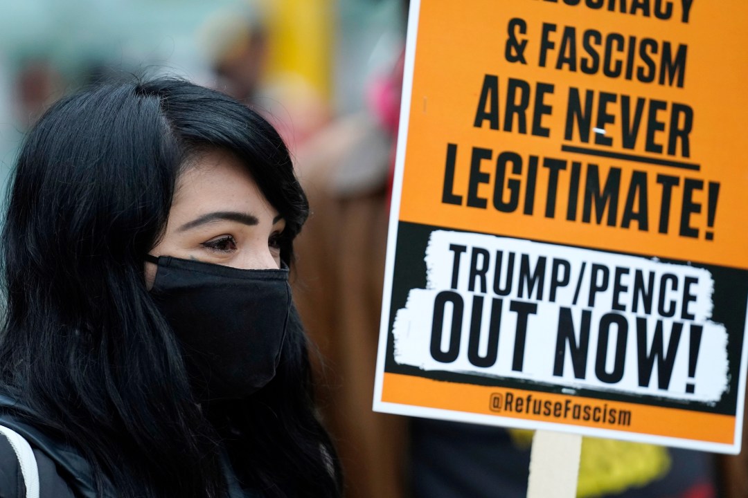 Cris Marie wears a mask as she holds a sign near Trump Tower during a Refuse Fascism Rally in Chicago, Saturday, Nov. 14, 2020. (AP Photo/Nam Y. Huh)