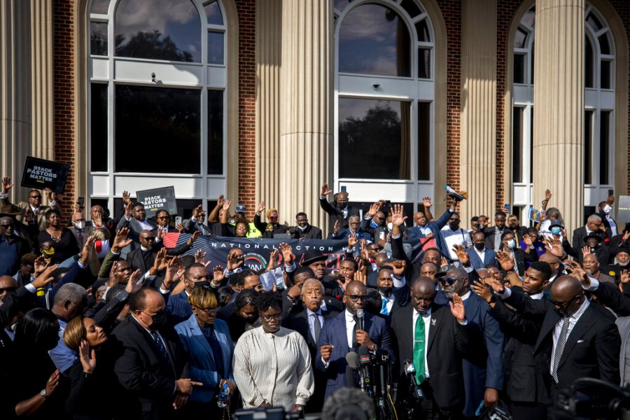 Pastor Jamal Bryant, bottom center, leads a group prayer for to nearly 750 pastors, supporters and family of Ahmaud Arbery gathered outside the Glynn County Courthouse during a Wall of Prayer event, Thursday, Nov. 18, 2021, in Brunswick, Ga. Last week Sharpton’s attendance in the trial of Greg McMichael and his son, Travis McMichael, and a neighbor, William “Roddie” Bryan prompted defense attorney Kevin Gough to object to his presence and other Black pastors in court. (AP Photo/Stephen B. Morton)