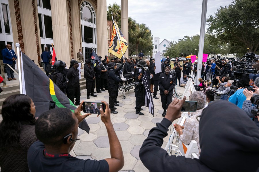 Dozens of Black Lives Matter and Black Panther protesters gather outside the Glynn County Courthouse where the trial of Travis McMichael, his father, Gregory McMichael, and William “Roddie” Bryan is held, Monday, Nov. 22, 2021, in Brunswick, Ga. The three men charged with the February 2020 slaying of 25-year-old Ahmaud Arbery. (AP Photo/Stephen B. Morton)