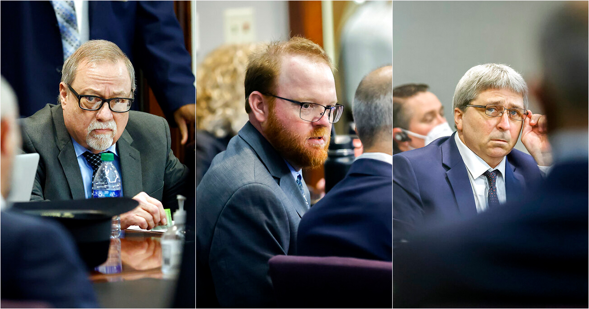 Greg McMichael (left), his son Travis McMichael (center) and William “Roddie” Bryan were sentenced to life in prison Jan. 7, 2022. (AP Photo/Stephen B. Morton, Pool)