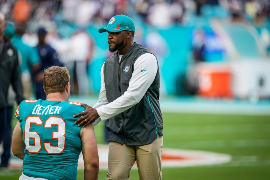 FILE – Miami Dolphins head coach Brian Flores talks with Miami Dolphins center Michael Deiter (63) ahead of the start of an NFL football game against the New England Patriots, Sunday, Jan. 9, 2022, in Miami Gardens, Fla. Fired Miami Dolphins Coach Brian Flores sued the NFL and three of its teams Tuesday, Feb. 1, 2022 saying racist hiring practices by the league have left it racially segregated and managed like a plantation. (AP Photo/Willfredo Lee, File)