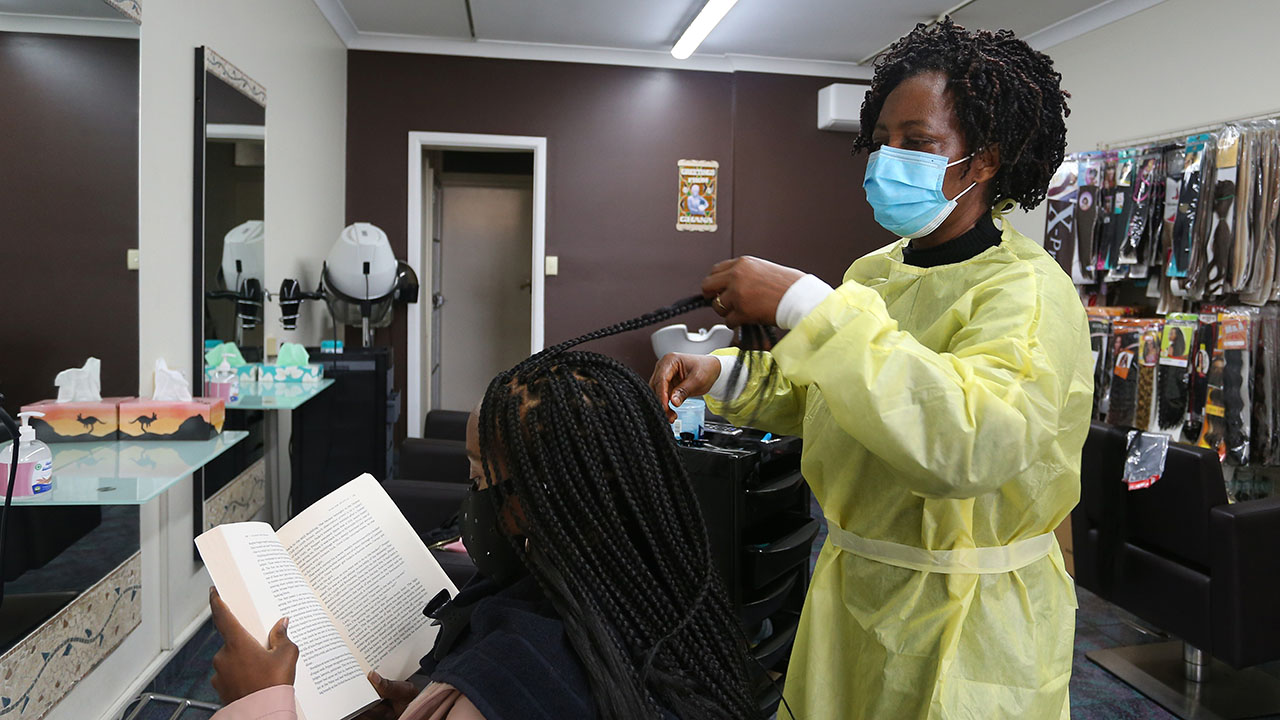 FILE: Senior stylist Esther braids a clients hair on Oct. 11, 2021. (Photo by Lisa Maree Williams/Getty Images)