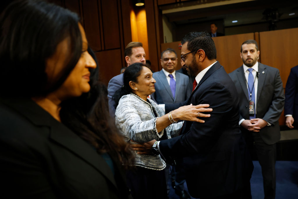 Kash Patel, President Donald Trump’s nominee to be Director of the Federal Bureau of Investigation (FBI), greets his family as he arrives to testify during his confirmation hearing before the Senate Judiciary Committee on January 30, 2025 in Washington, DC. (Photo by Kevin Dietsch/Getty Images)