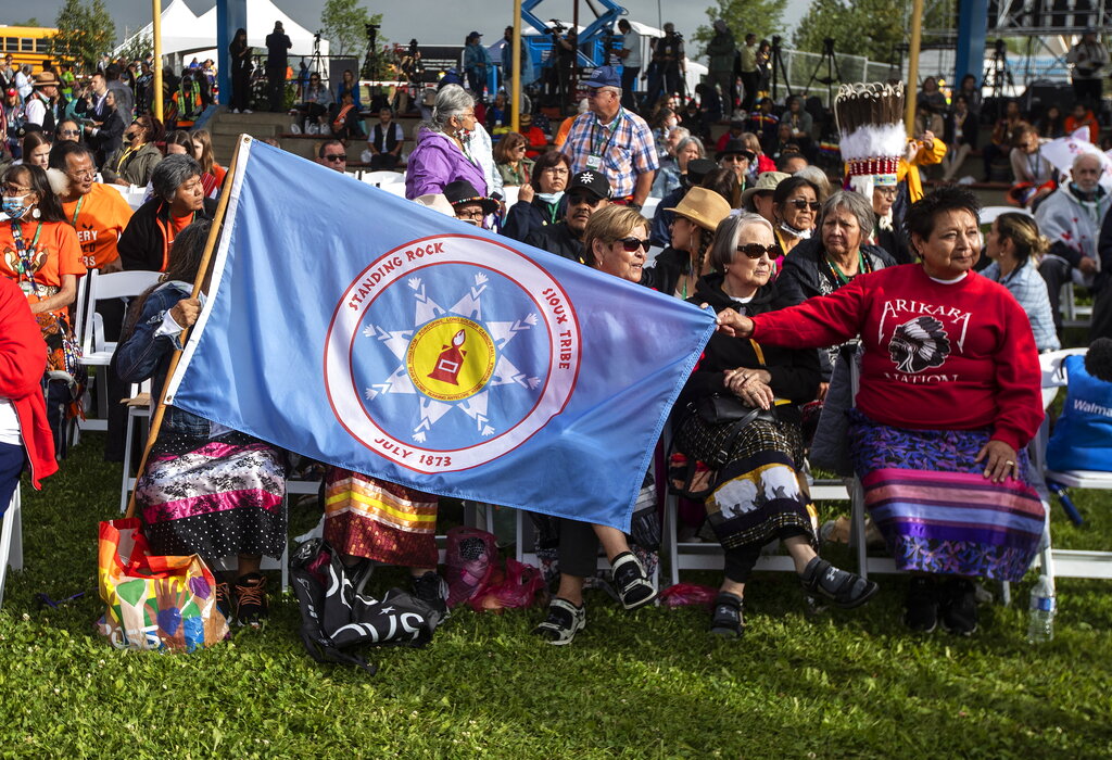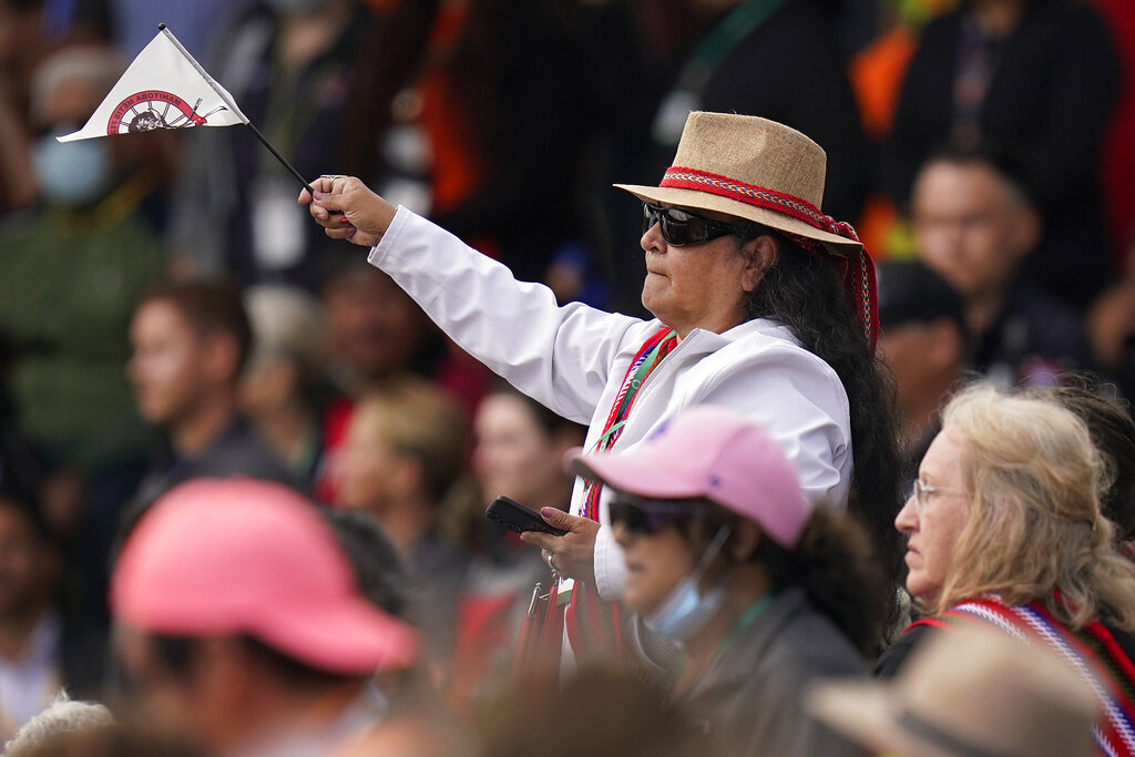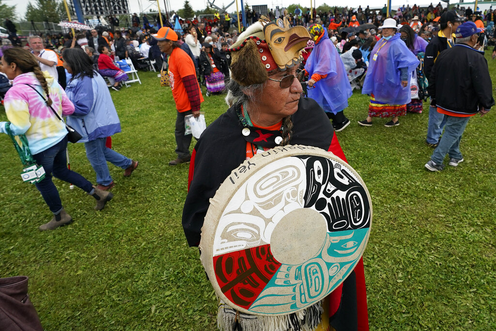 Many in the crowd wore traditional dress, including colorful ribbon skirts and vests with Native motifs. Others donned orange shirts, which have become a symbol of school survivors, recalling the story of one woman whose beloved orange shirt, a gift from her grandmother, was confiscated at a school and replaced with a uniform.