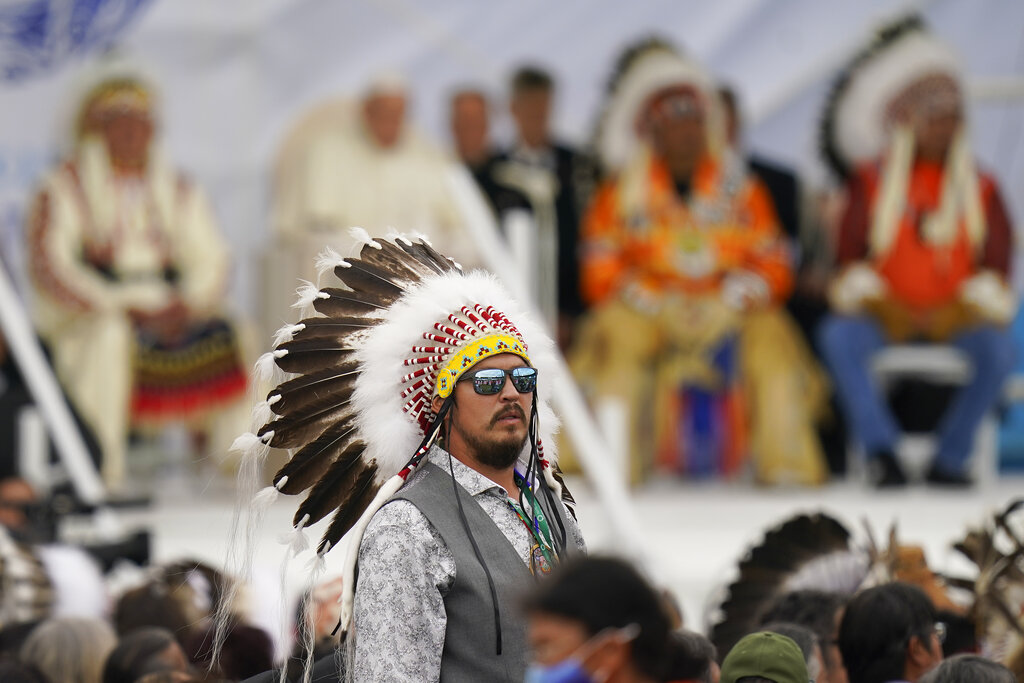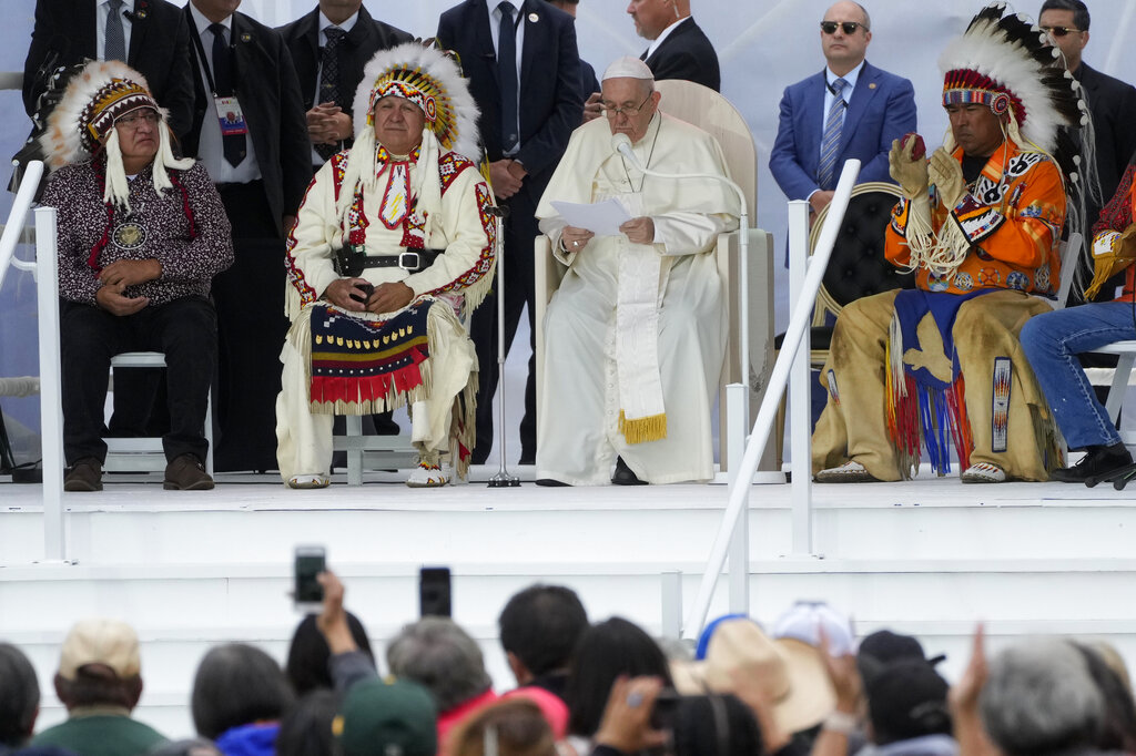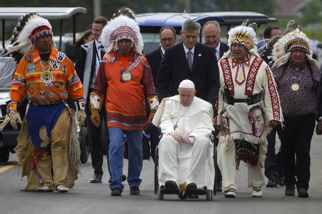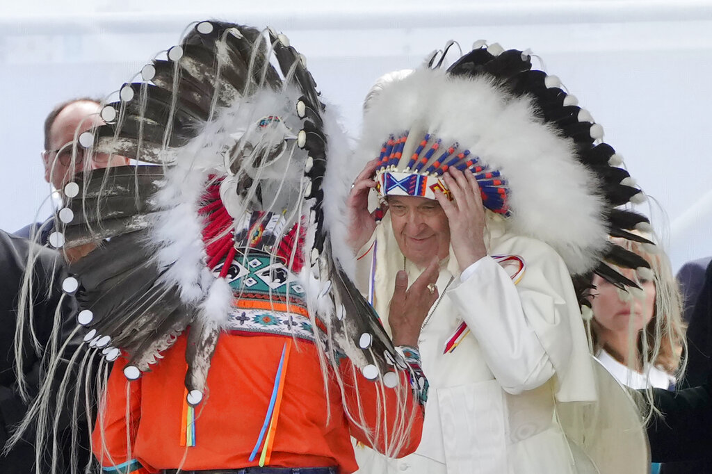 In the first event of his weeklong “penitential pilgrimage,” Francis traveled to the lands of four Cree nations to pray at a cemetery and then deliver the long-sought apology at nearby powwow ceremonial grounds. Four chiefs escorted the pontiff in a wheelchair to the site near the former Ermineskin Indian Residential School, and presented him with a feathered headdress after he spoke, making him an honorary leader of the community.