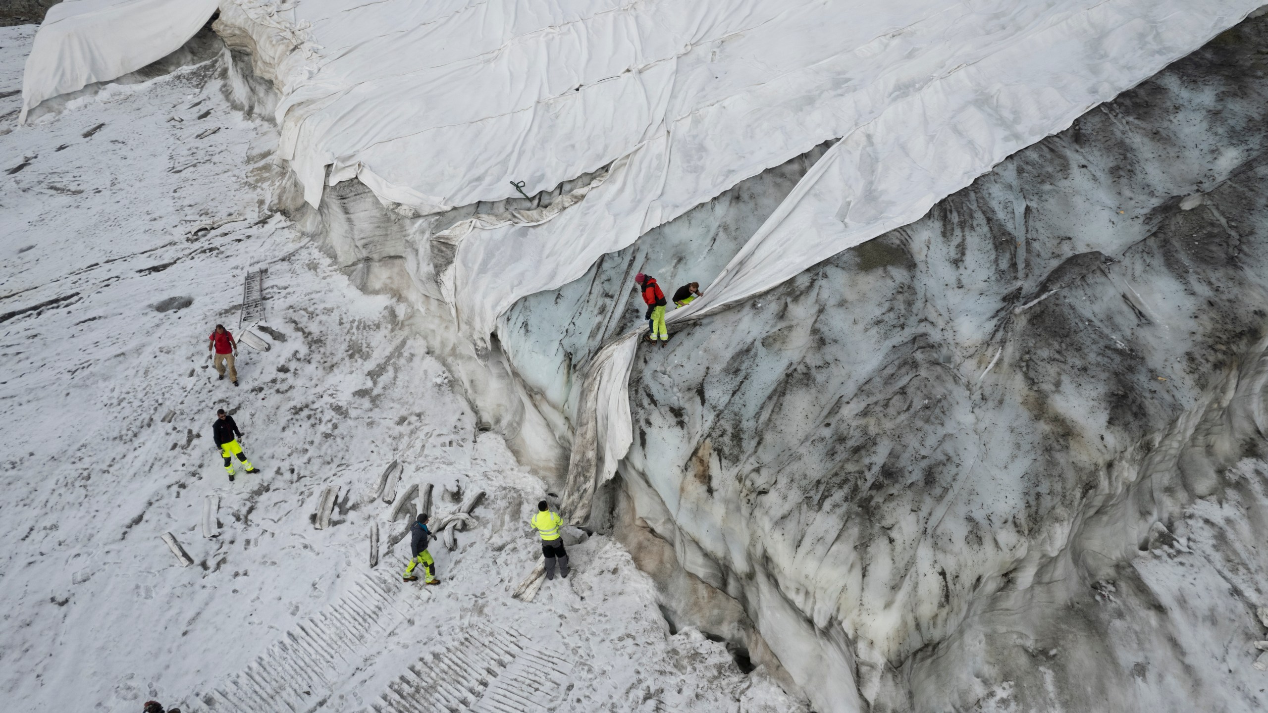 FILE –People work on a tarpaulin which cover the ice of the Corvatsch glacier, near Samedan, Switzerland, Monday, Sept. 5, 2022. Glaciologists have stopped their program to measure the glacier. The decision has already been taken in 2019 and the hot summer of 2022 has led to “extreme losses of ice” and the end of the program. The covered part of the glacier is used as a ski slope in winter. (Gian Ehrenzeller/Keystone via AP,file)