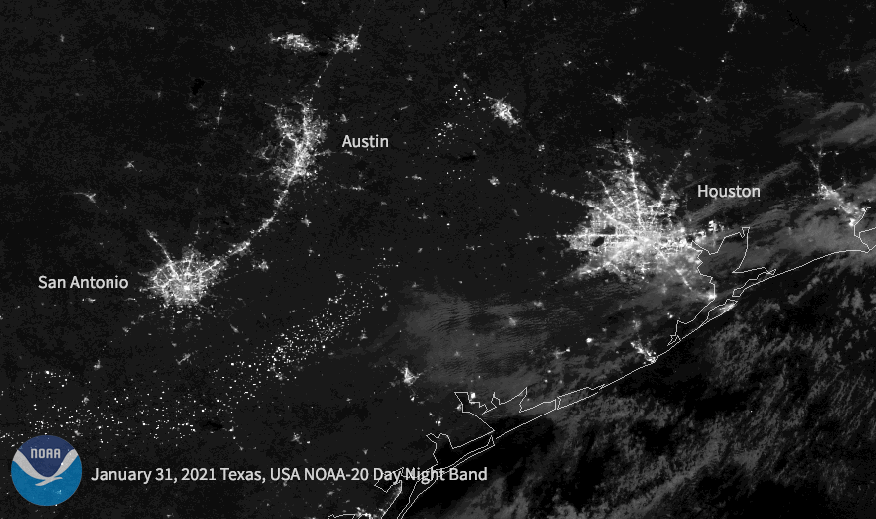 The NOAA-20 satellite’s images show bright city lights across Texas before the storm on Jan. 31, 2021 and the significantly dimmer image during the storm and outages on Feb, 16, 2021.