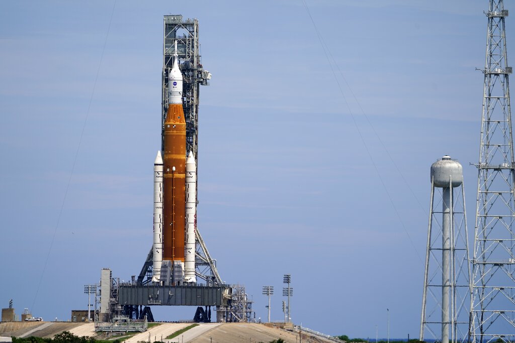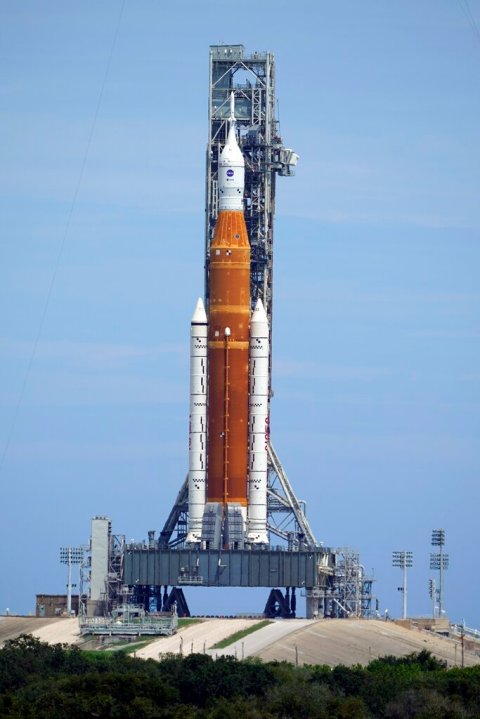 The 322-foot rocket — the most powerful ever built by NASA — remains on its pad at Kennedy Space Center with an empty crew capsule on top.