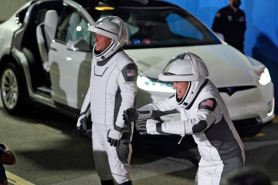 European Space Agency astronaut Thomas Pesquet, of France, left, and Japan Aerospace Exploration Agency astronaut Akihiko Hoshide wave as they leave the operations and checkout building before a launch attempt Friday, April 23, 2021, at the Kennedy Space Center in Cape Canaveral, Fla. Four astronauts will fly on the SpaceX Crew mission to the International Space Station scheduled for launch on April 23, 2021. (AP Photo/John Raoux)