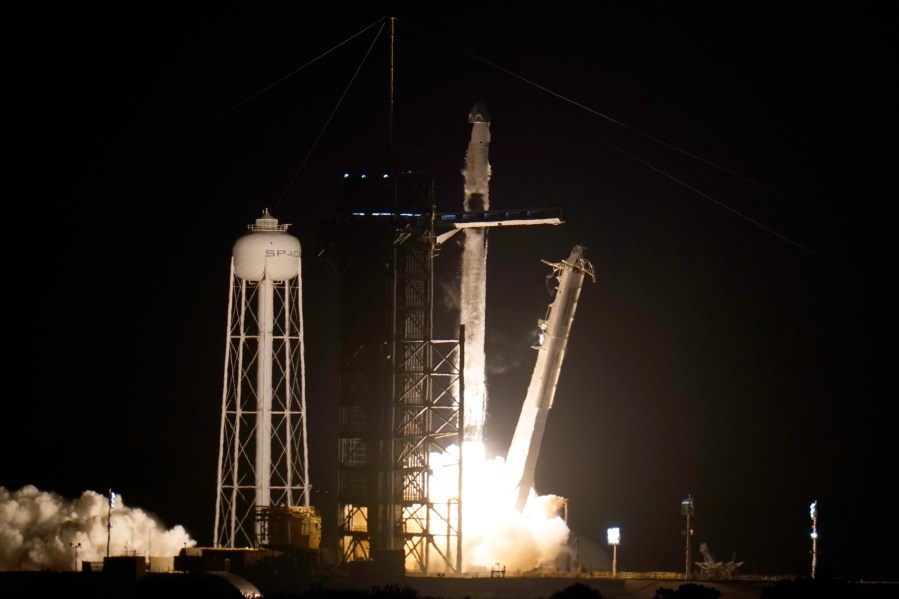 A SpaceX Falcon 9 rocket with the Crew Dragon space capsule lifts off from pad 39A at the Kennedy Space Center in Cape Canaveral, Fla., Friday, April 23, 2021. (AP Photo/Brynn Anderson)