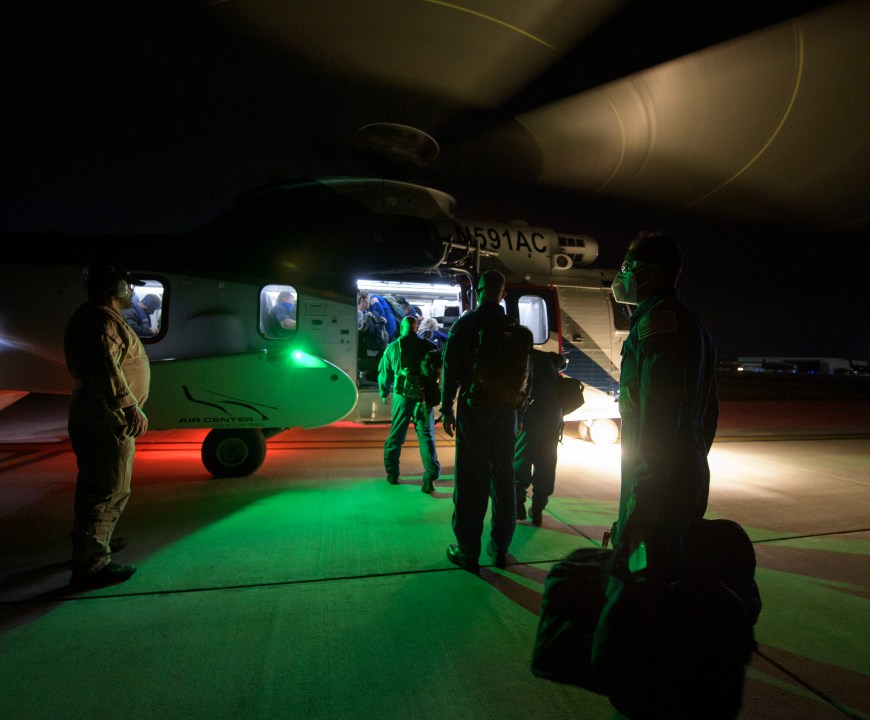 In a photo provided by NASA, NASA and SpaceX support teams board a helicopter at Pensacola, Fla., Saturday, May 1, 2021, to head to a ship in the Gulf of Mexico. A SpaceX capsule carrying four astronauts departed the International Space Station late Saturday, aiming for a rare nighttime splashdown to end the company’s second crew flight. It would be the first U.S. splashdown in darkness since Apollo 8′s crew returned from the moon in 1968. (Bill Ingalls/NASA via AP)