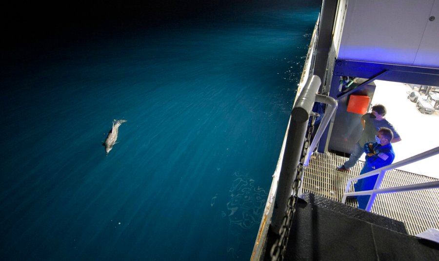 Bill Spetch, manager of the NASA International Space Station Transportation Integration Office, and NASA astronaut representative Joe Acaba watch a dolphin swim next to a ship Saturday, May 1, 2021, as NASA and SpaceX teams prepared for the splashdown of the SpaceX capsule in the Gulf of Mexico off the coast of Panama City, Fla., Saturday, May 1, 2021. (Bill Ingalls/NASA via AP)