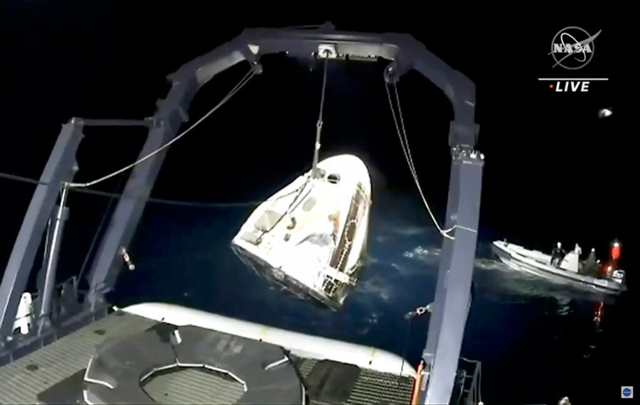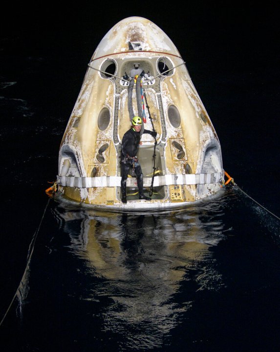 SpaceX had practiced for a nighttime return, just in case, and even recovered its most recent station cargo capsule from the Gulf of Mexico in darkness. Infrared cameras tracked the capsule as it re-entered the atmosphere; it resembled a bright star streaking through the night sky.